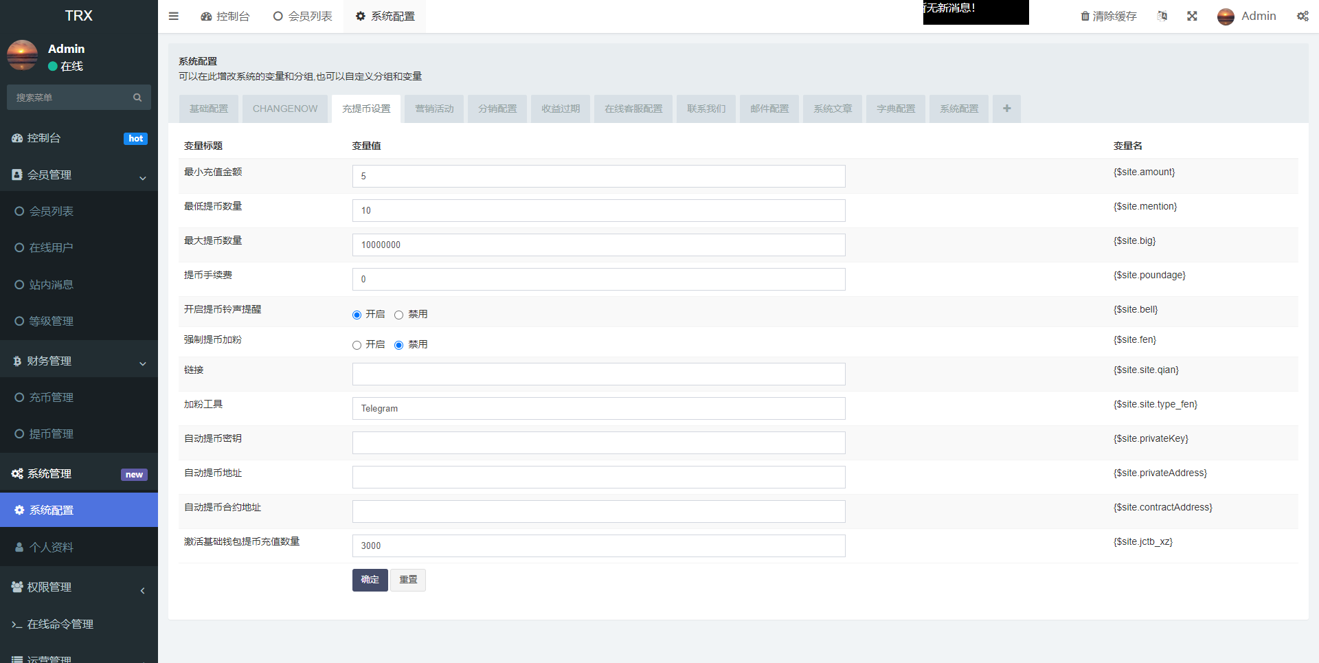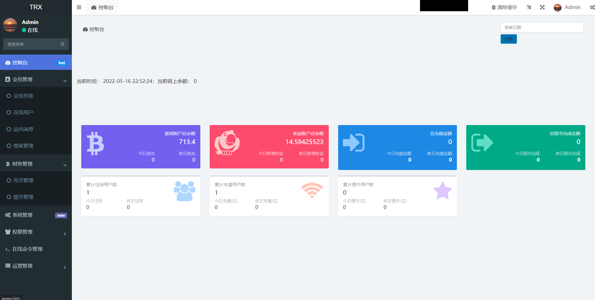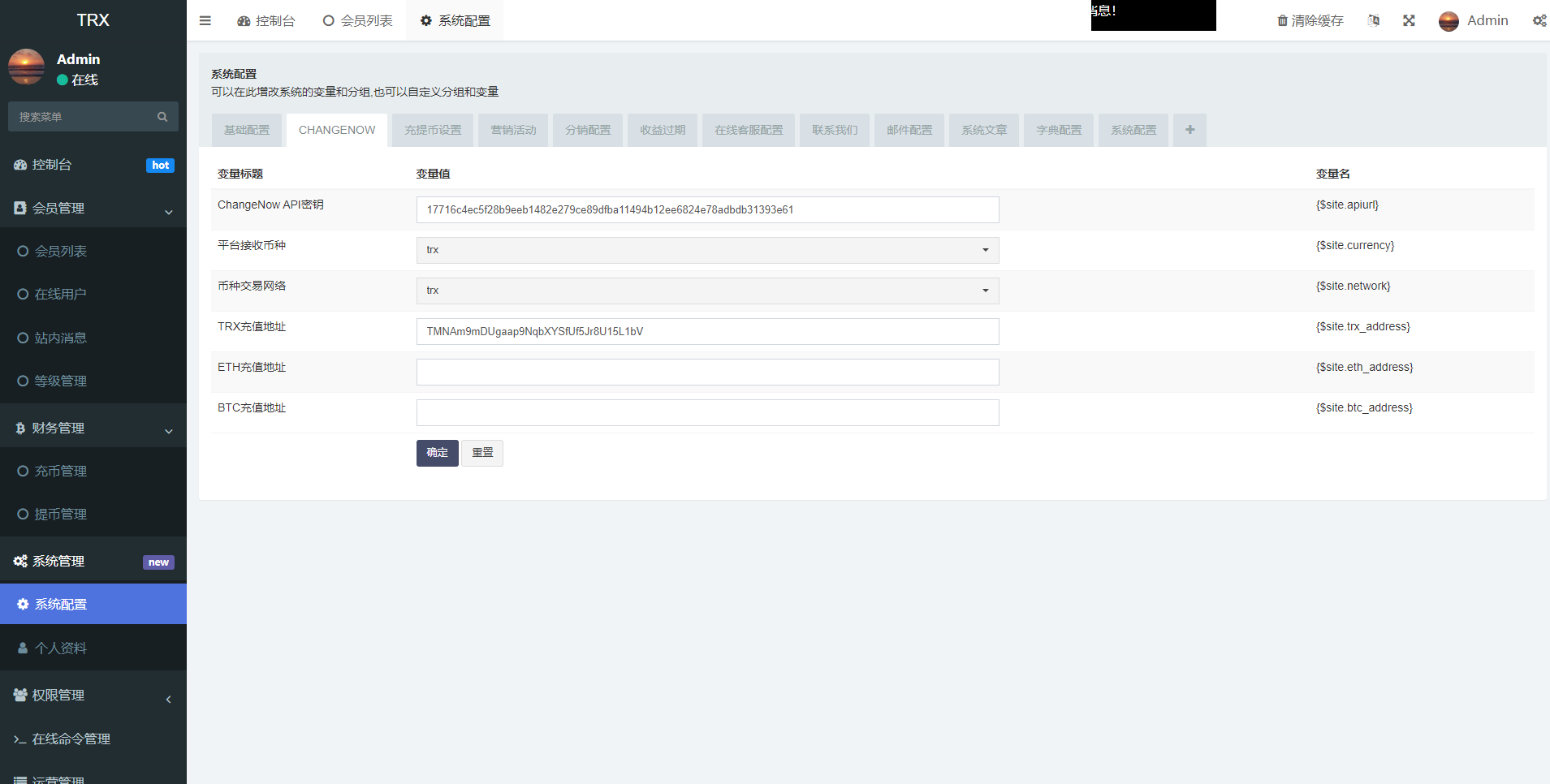 1. 充值。用户进入充值页面点击充值输入金额系统将会自动生成汇款地址(USDT.BTC,ETH,TRX)用户可选择汇款的方式,该地址对接第三方,每次充值的地址都不一样