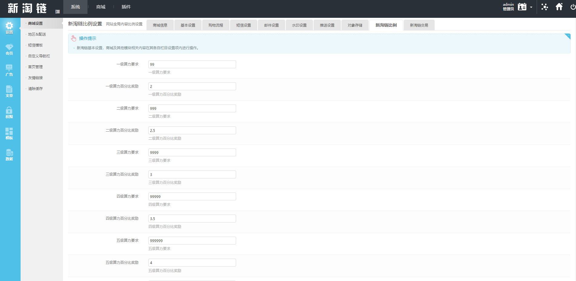 新淘链的系统四个关键: 1.投资获得本金之后,再次获得的消费静态收入扣除10-50% 2.消费算静态收入总的五倍封顶, 3.创业合伙人是总收入十倍封顶, 4.经销商是二十倍封顶, 5.代理商是五十倍封顶; 6.股东合伙人是一百倍封顶, 7.动态算力日封顶是账户新淘链的50%-100,以上所有数据可以调整。 |