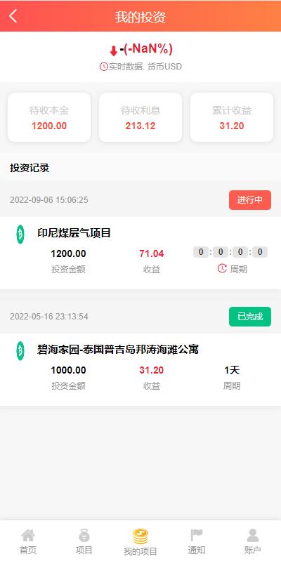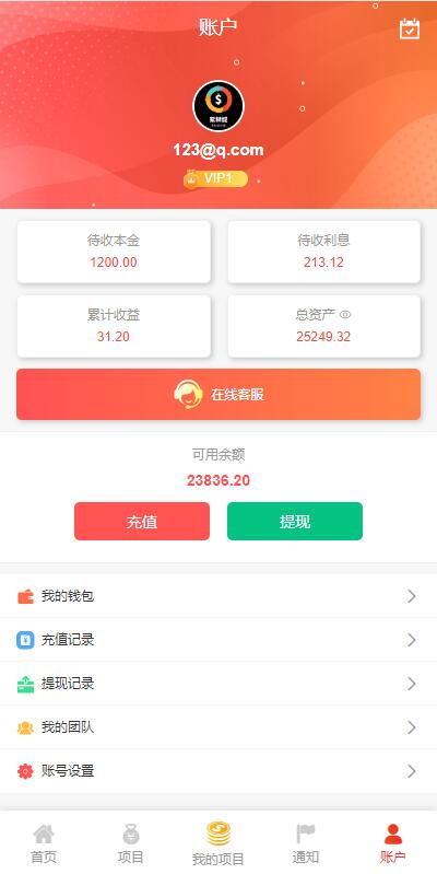用户注册成功->认证邮箱->充值->购买项目->生成订单->根据设定的收益每日返利->末天返还本金->提现时先添加钱包->发起提现->后台审核通过->提现到账