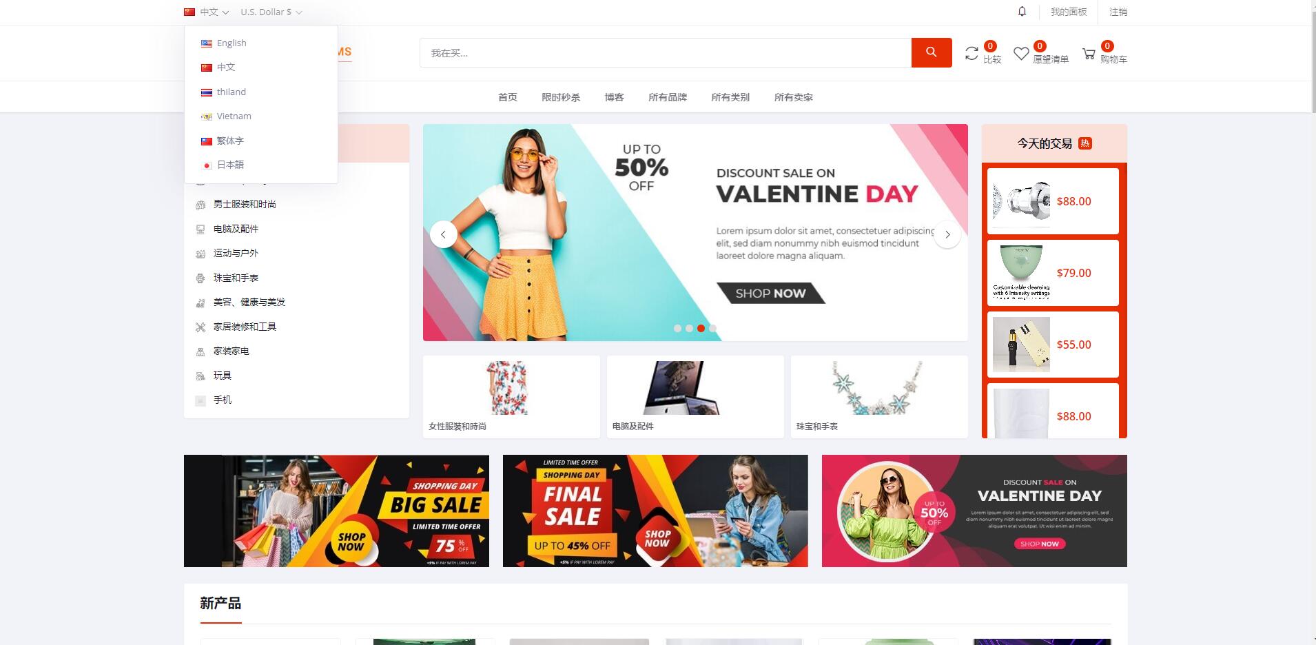 多语言海外电商系统,前端多种语言切换,支持后台添加任意语言