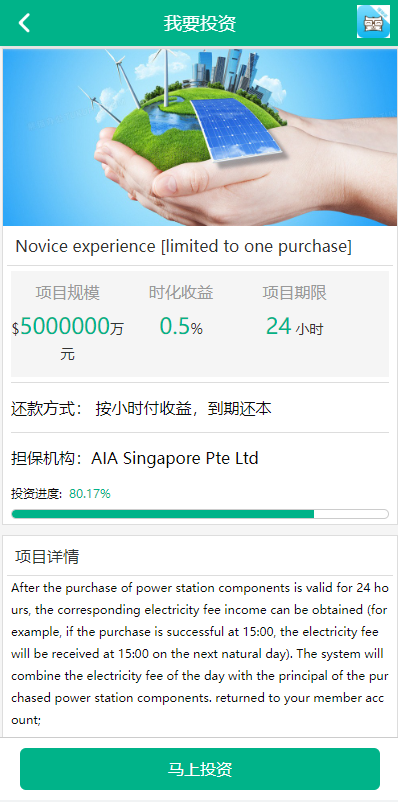 分红模式: 1、每小时返息,到期还本 2、每日返息,到期还本 3、每周返息,到期还本 4、每月返息,到期还本 5、每日得利,保本保息 6、到期还本还息
