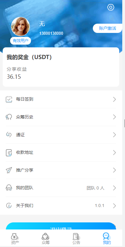 普通会员可看到的数据及功能:静态,动态,极差奖(达到V级别才可看到),幸运池(数据可改动),团队只能看到自己直推的第.1代,可显示团队总业绩(①预约中②投资中)及投资中数量,及总人数(只能看到手机号的前3后4位)