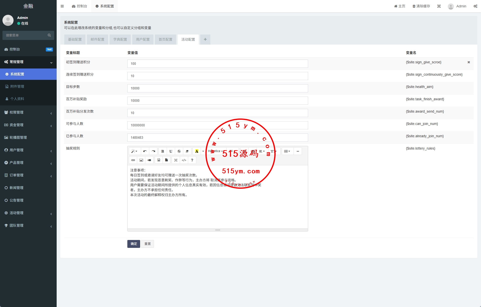 前端VUE开发,后端FastAdmin框架全开源系统功能:签到、抽奖、爱心公益、借贷、健康数据、积分商城、活动任务等功能
