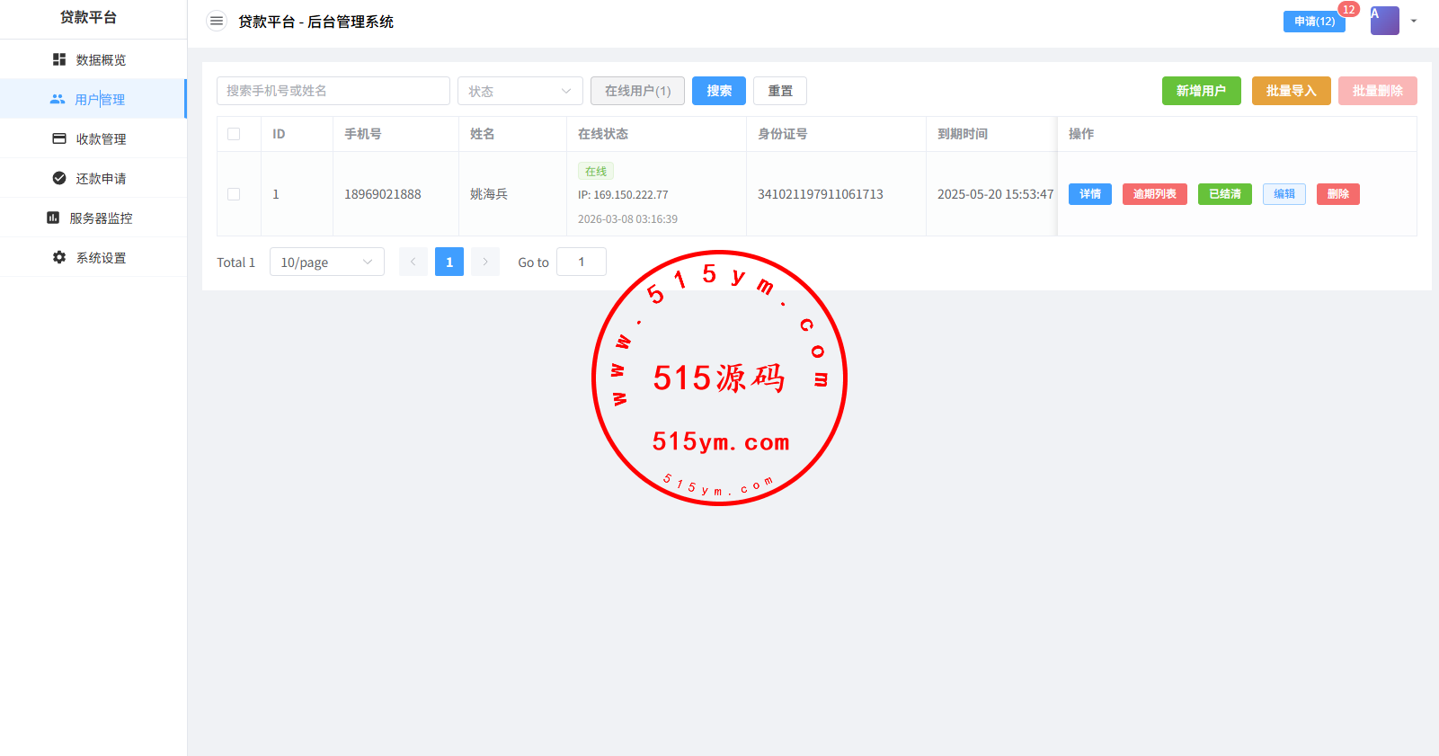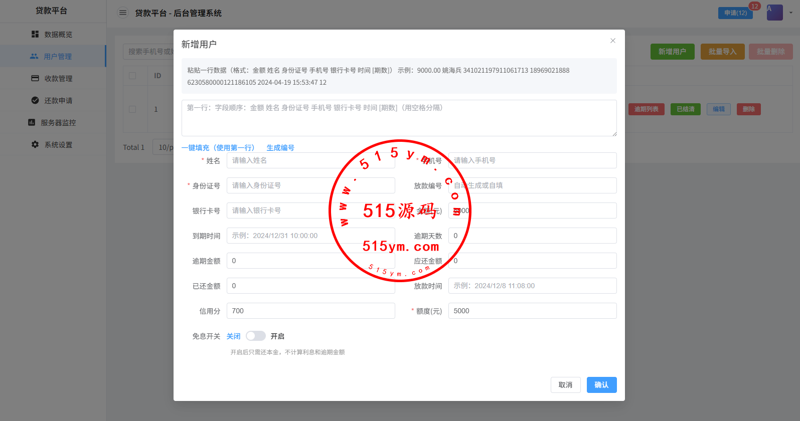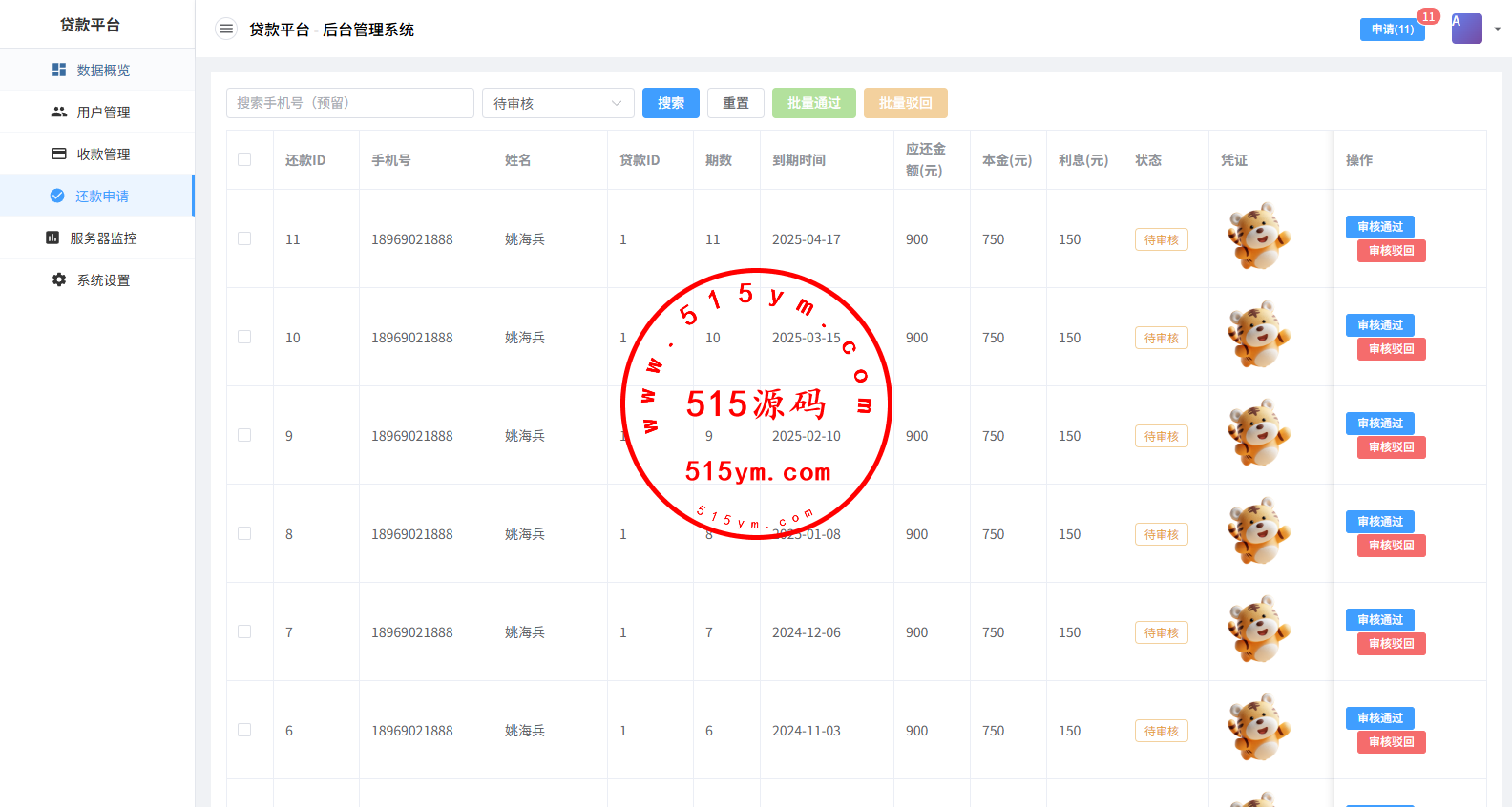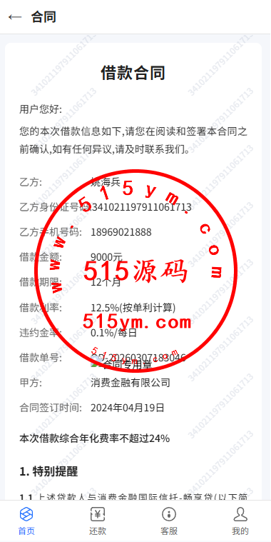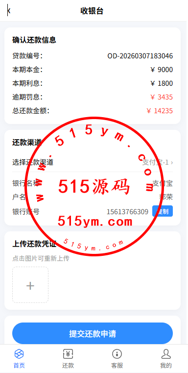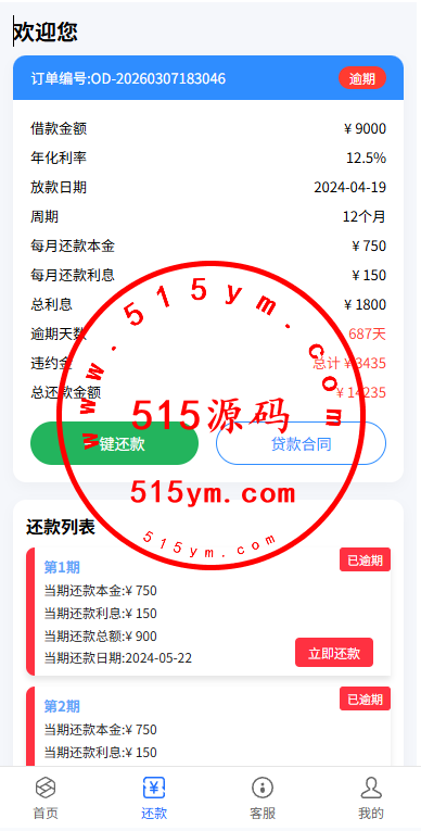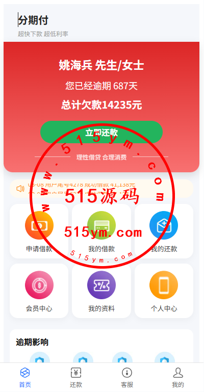 系统前端后台VUE开发,服务端JAVA开发全开源带源码后台可一键填充用户数据生成贷款逾期前端用户手机登陆,就能查看自己的欠款信息