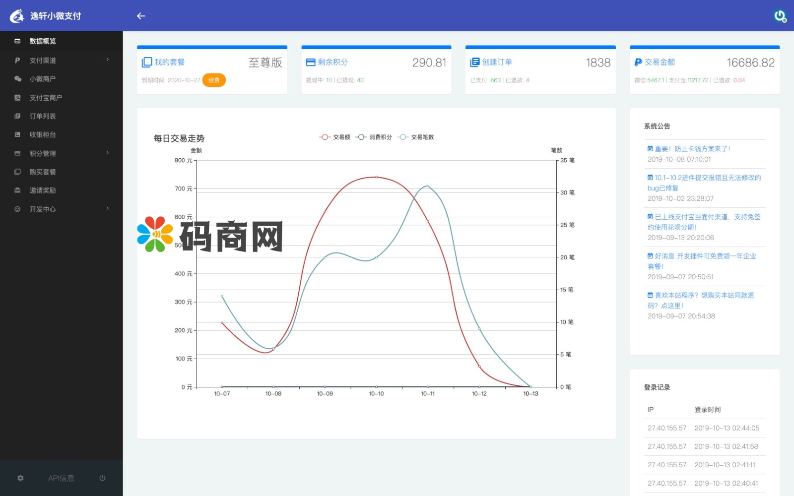 用户中心:数据统计+无限进件+多商户管理+轮训收款+收银柜台(二维码聚合收款,收款方式支持:自定义金额+固定金额)+订单明细+积分充值/明细/提现+邀请注册(支持短链接邀请/图片海报邀请)+费率套餐(自定义设置价格和费率)+在线支付测试(全部通道都可以测试)+API信息/账户信息(微信绑定、支付宝绑定)