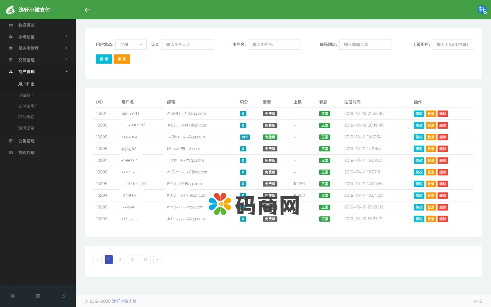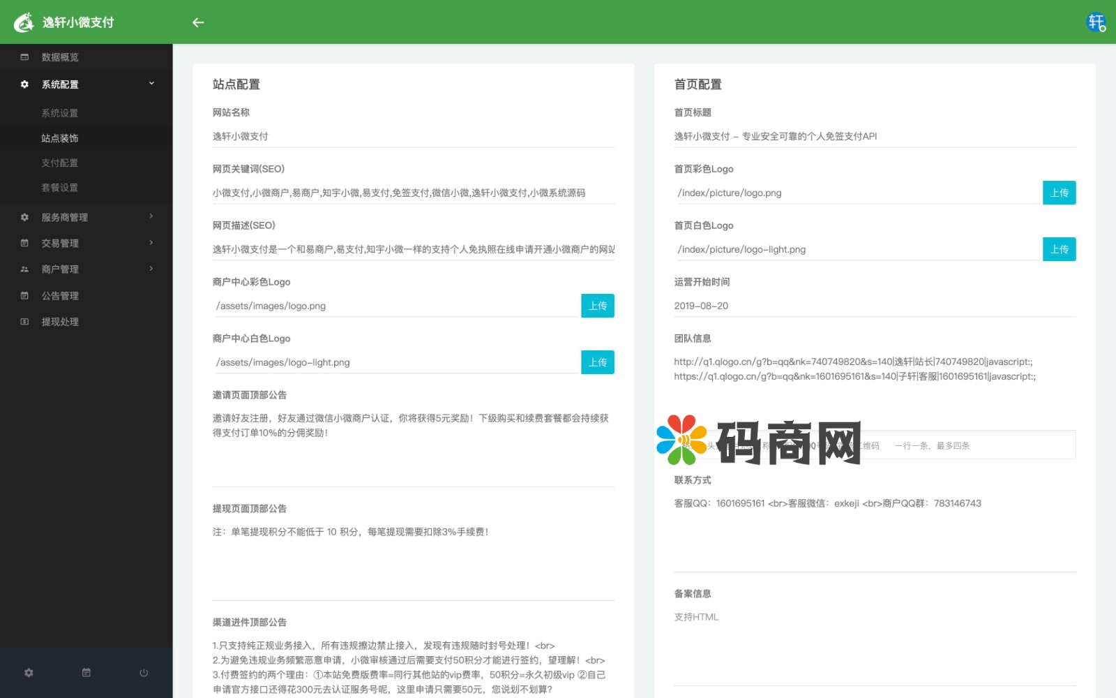 管理后台:数据统计+系统设置+服务商添加/上线/下线/排序+费率/套餐设置+用户管理/商户管理+订单管理+公告/文章+积分/邀请明细+提现处理