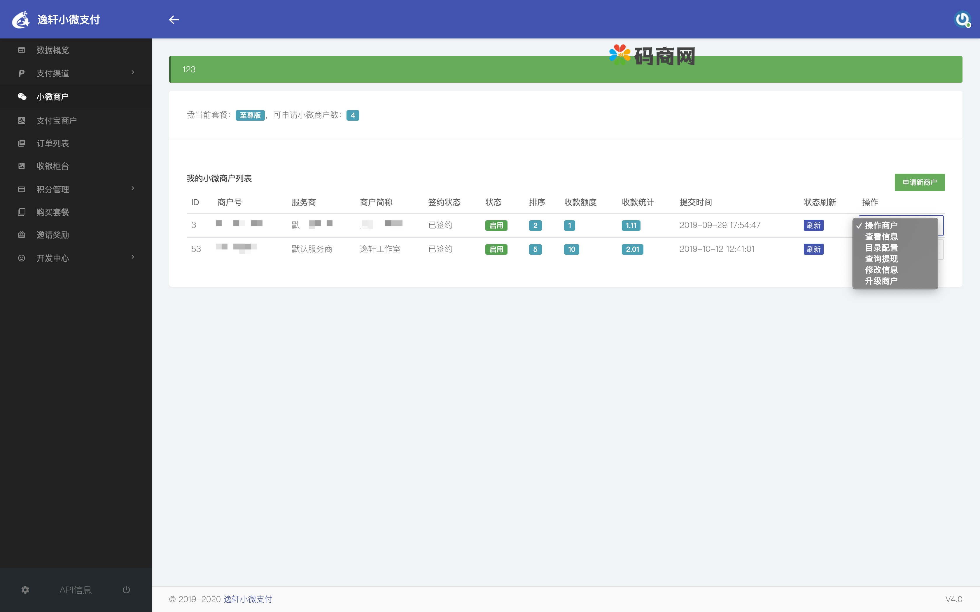 2.后台运营商:在后台添加微信服务商、支付宝服务商,可以添加多个,作为运营商我们的盈利主要靠API手续费,用户使用api会消耗积分,想要低手续费就可以买VIP包月/包年套餐,然后等着用户充值和买API套餐就好了,全程基本不用管,前台用户自己就能搞定,另外作为服务商还有微信和支付宝官方给的返佣,用户交易总额的0.2%-0.8%,就跟推广pos机和刷脸机的一样,只要下面用户消费,我们就有返佣,最容易的赚钱方式。