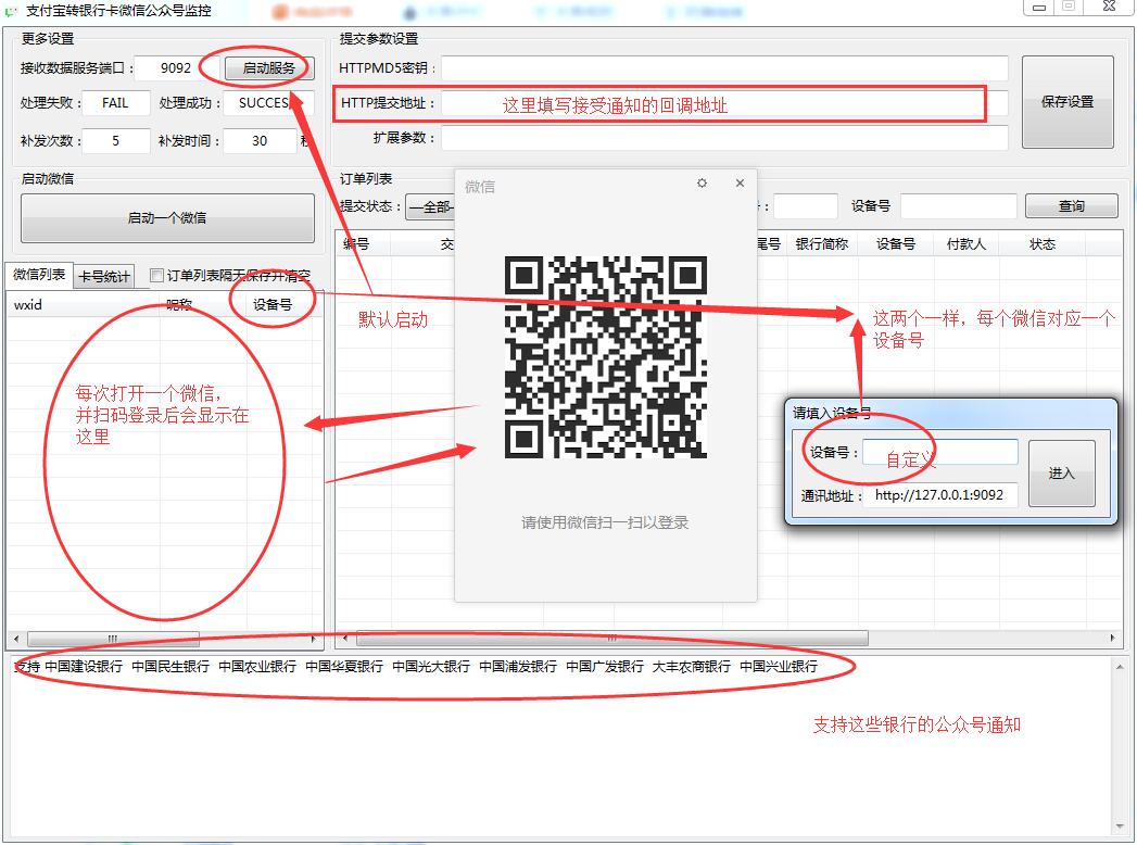 功能说明:实现对pc版微信监控公众号银行卡到账通知达到收款回调通知的作用。