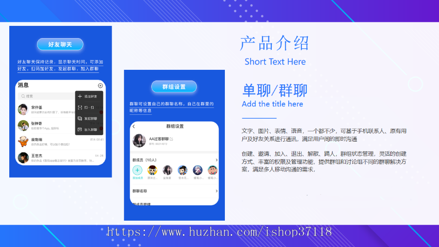 群功能:设置群二维码,群公告,昵称,头像,群共享文件,顶置聊天,消息免打扰,屏蔽群信息,指定某人单独禁言,全体禁言,举报,群管理,查找聊天记录,消息过期销毁,清空聊天记录等等功能。
