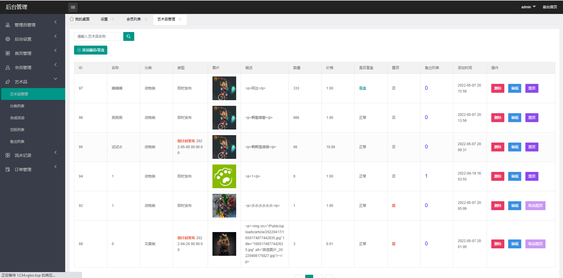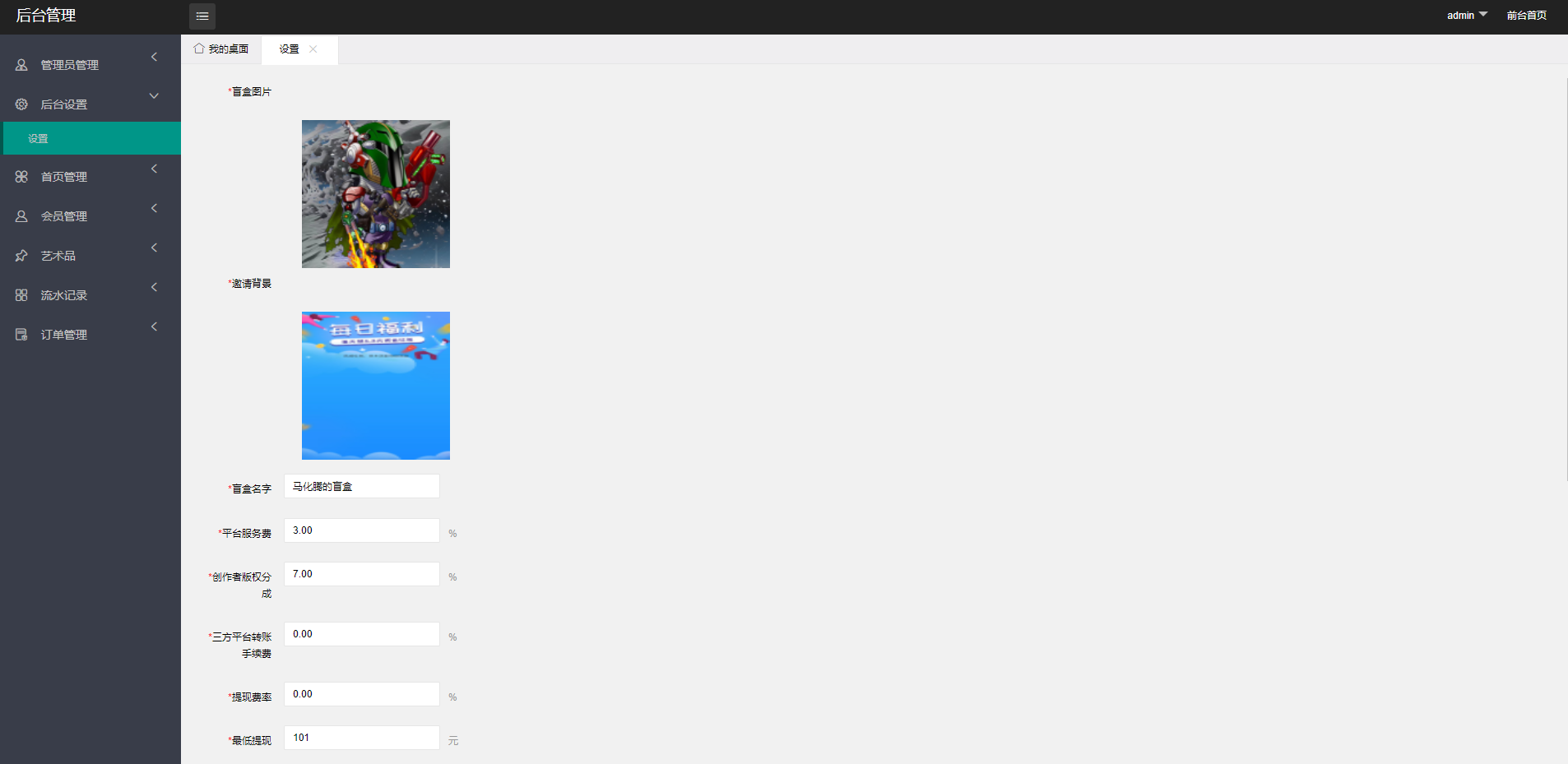盲盒:这张盲盒的图后台可以更换,盲盒也是有分类的,可以设置库存数量。盲盒的分类是和交易市场的分类是一致的,比方说交易市场里面有一个分类叫动物类,那么它不仅可以直接发布画,也可以发布动物类的盲盒,盲盒买了以后不是直接打开,买了之后就是一个盲盒,这个盲盒直接出现在我的盲盒里面,用户可以选择在我的盲盒版块里进行拆盲盒,如果拆了里面的画会进入到了我的藏品里面。也可以选择不拆开盲盒,将盲盒在交易市场进行出售,转售盲盒可以设置价格。