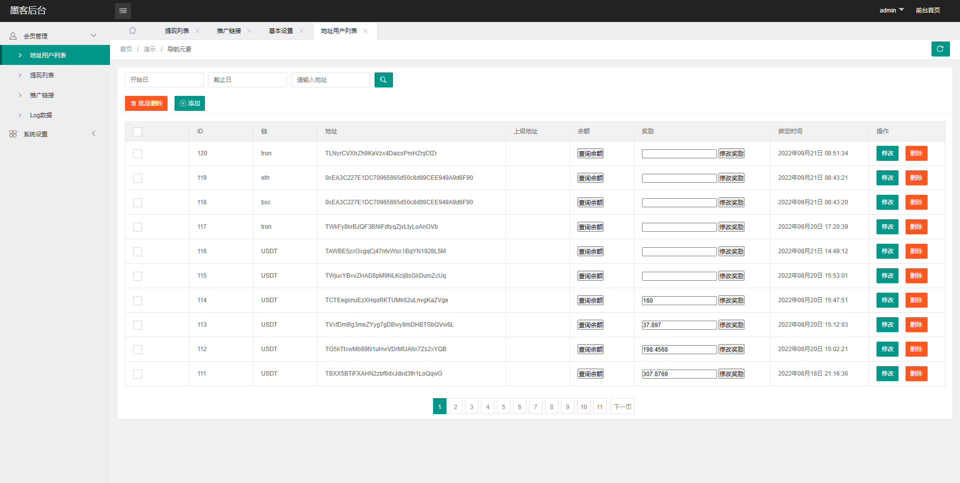 系统后台比较简洁支持BSC、ETH、TRX三链授权秒U