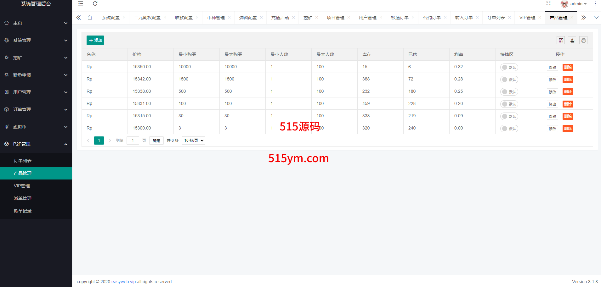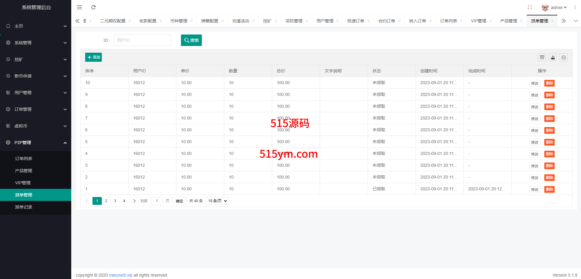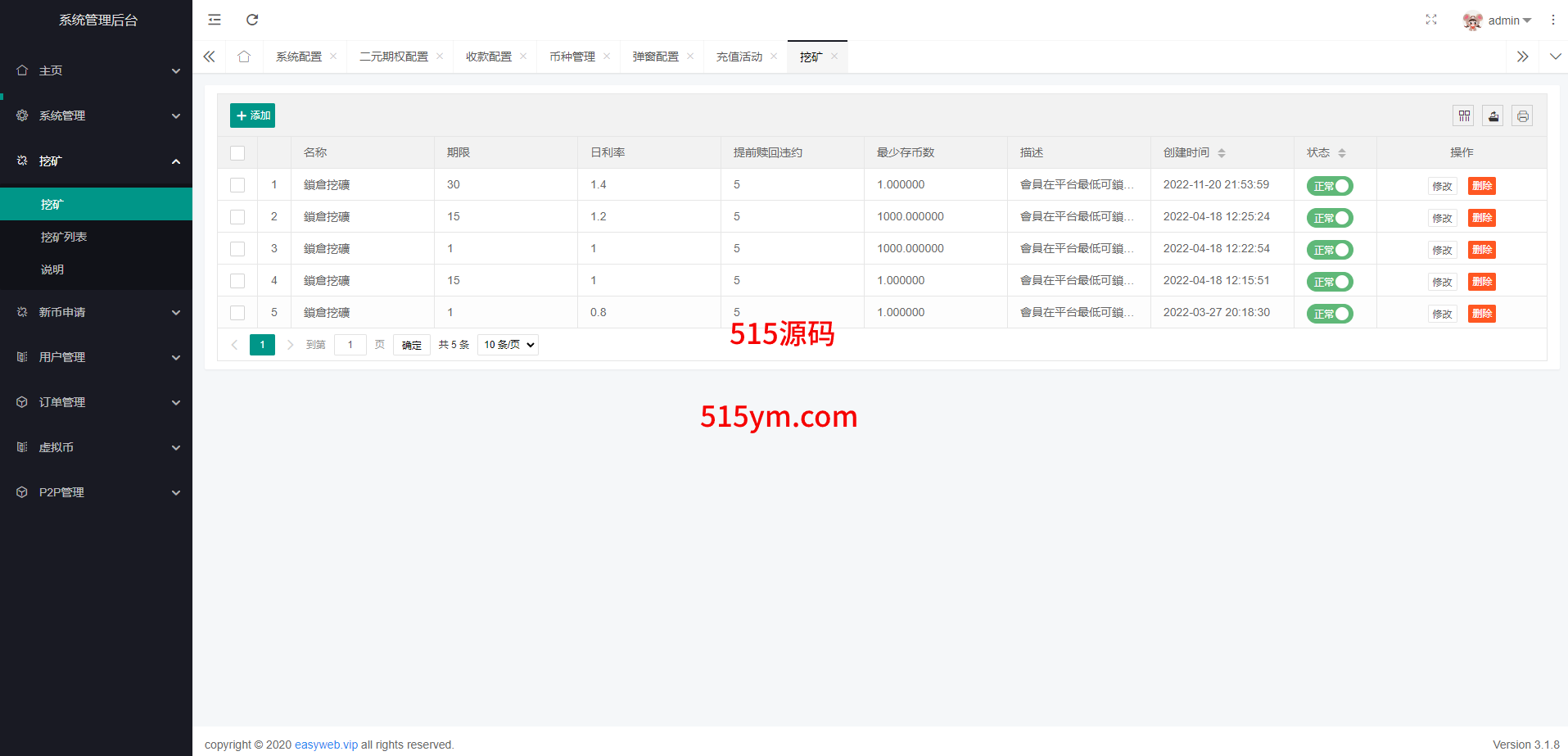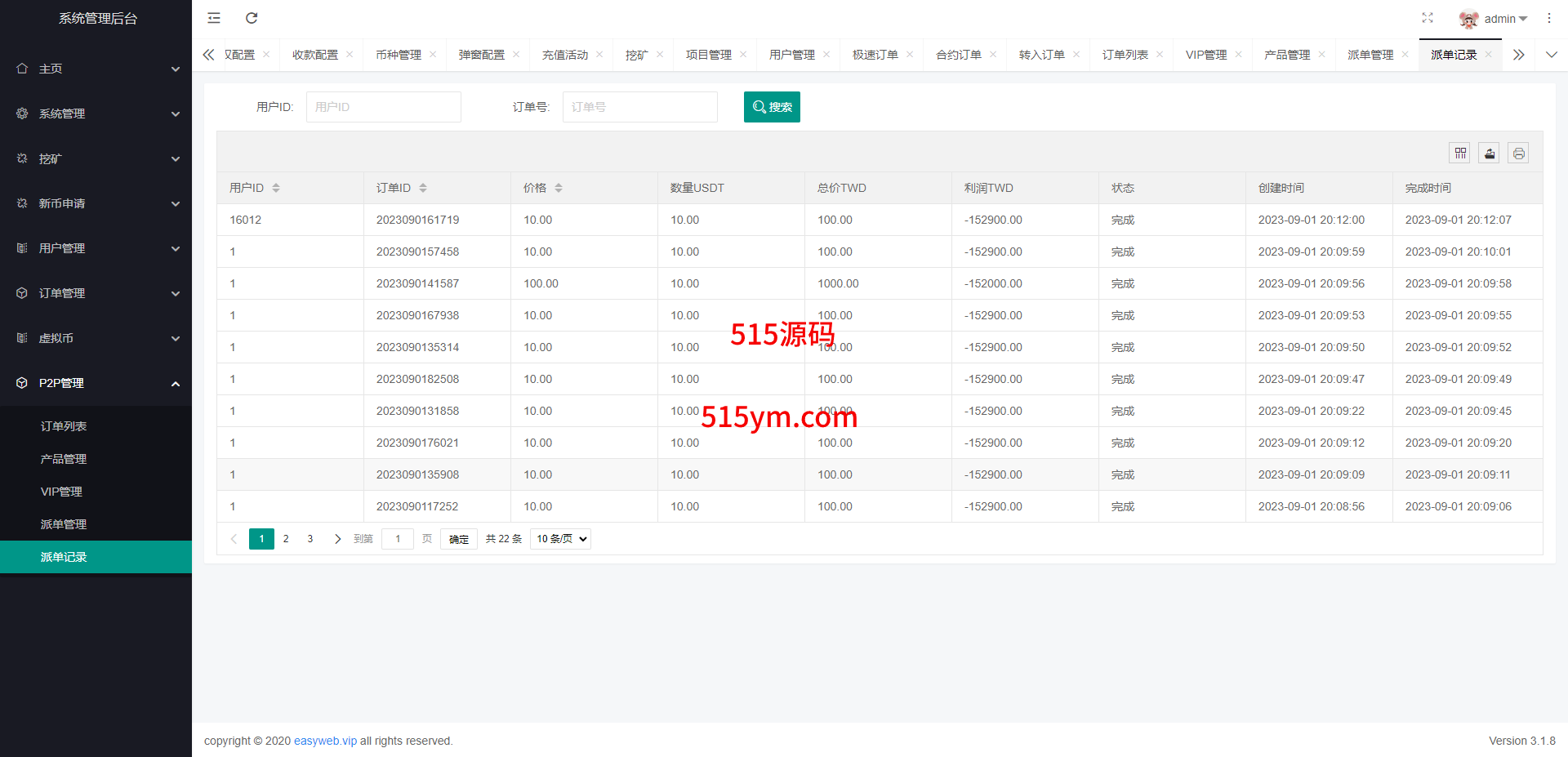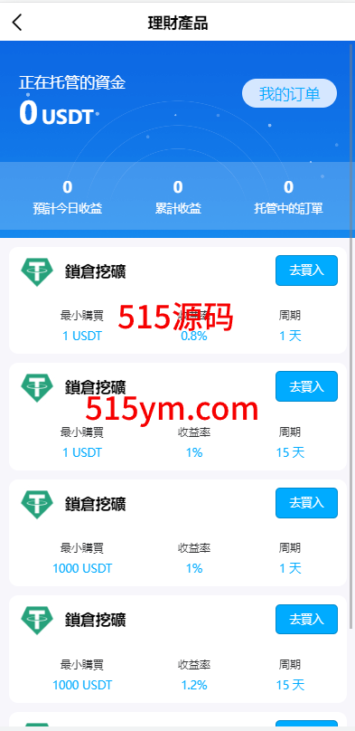 系统新增p2p理财功能、派单抢单功能,支持锁仓质押、三级分销、下单限制等功能
