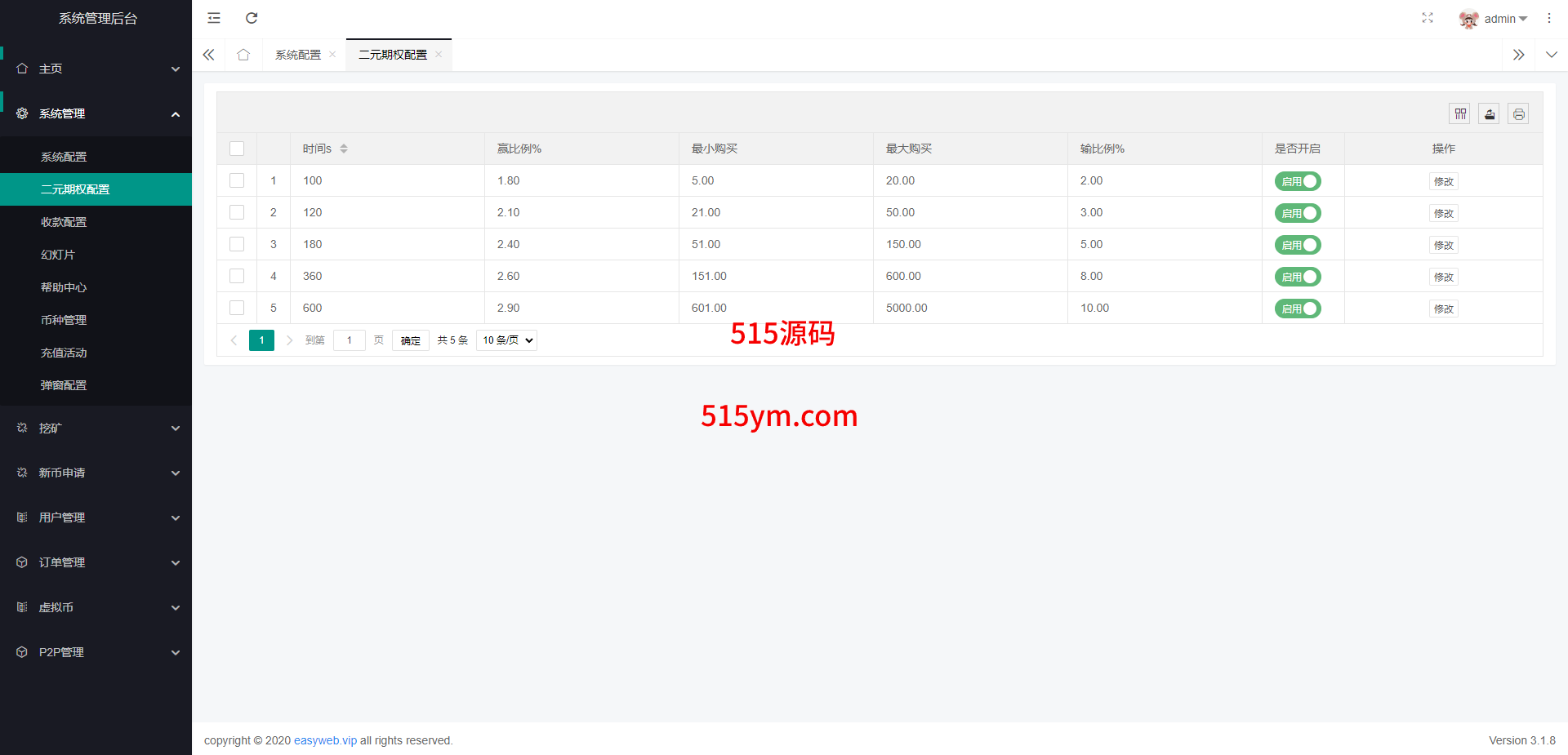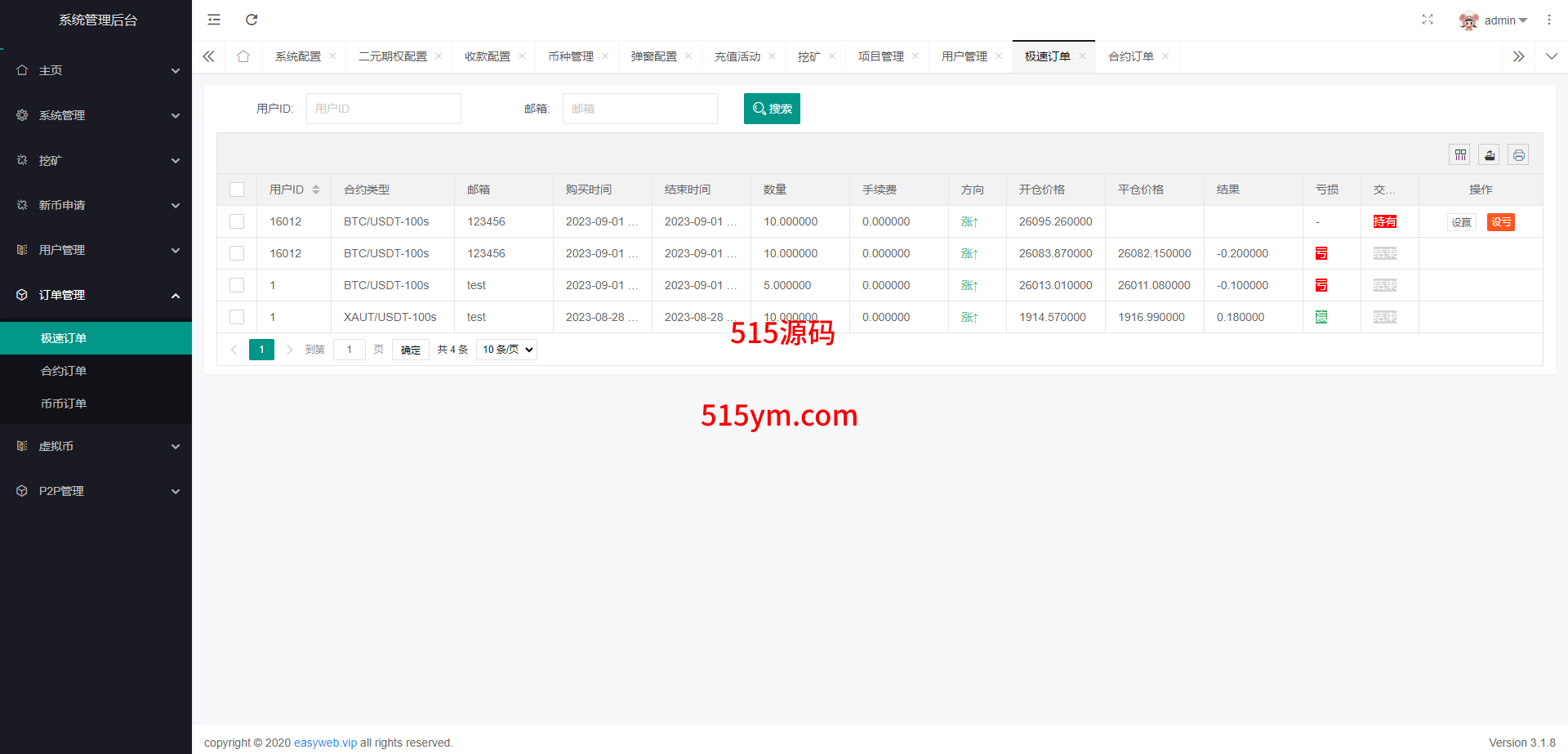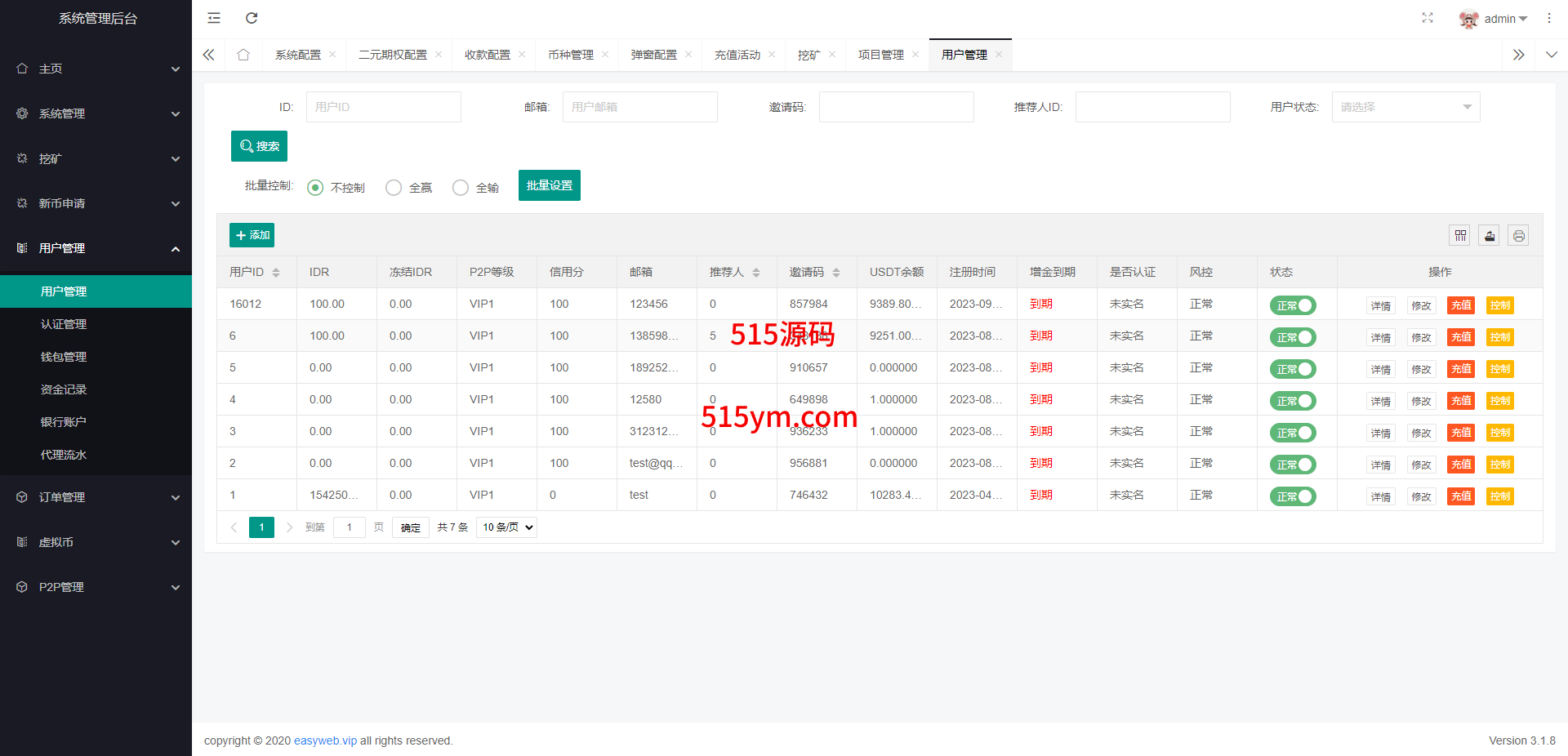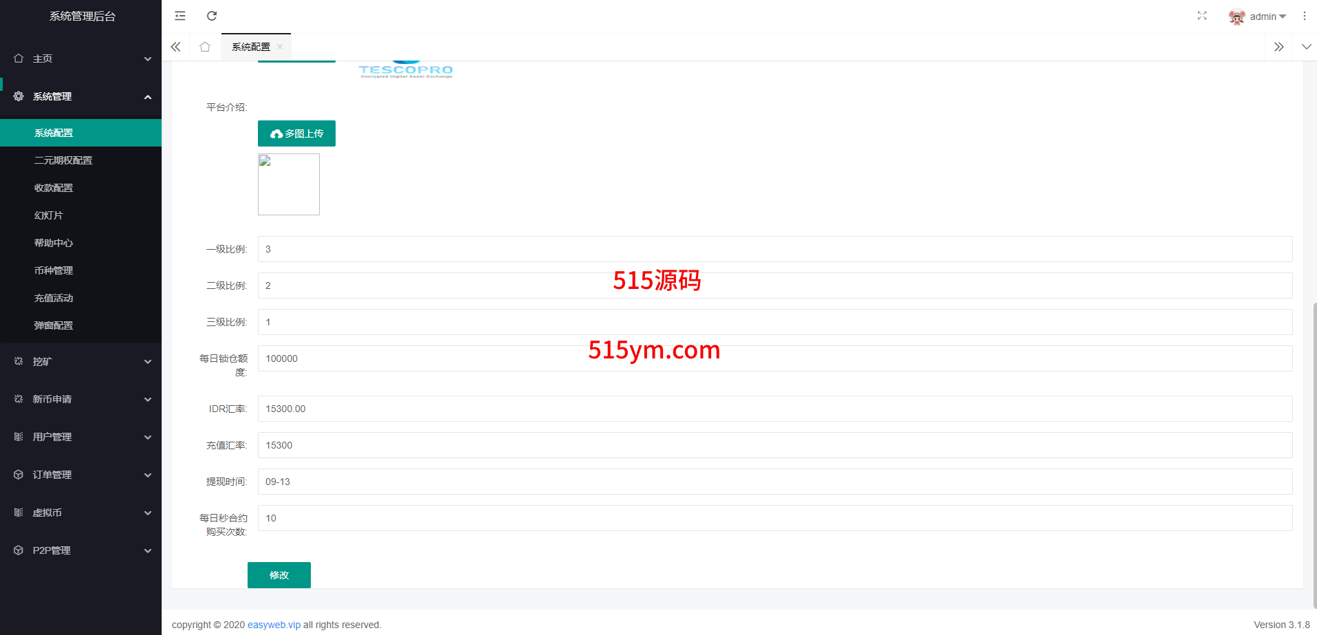 系统新增p2p理财功能、派单抢单功能,支持锁仓质押、三级分销、下单限制等功能