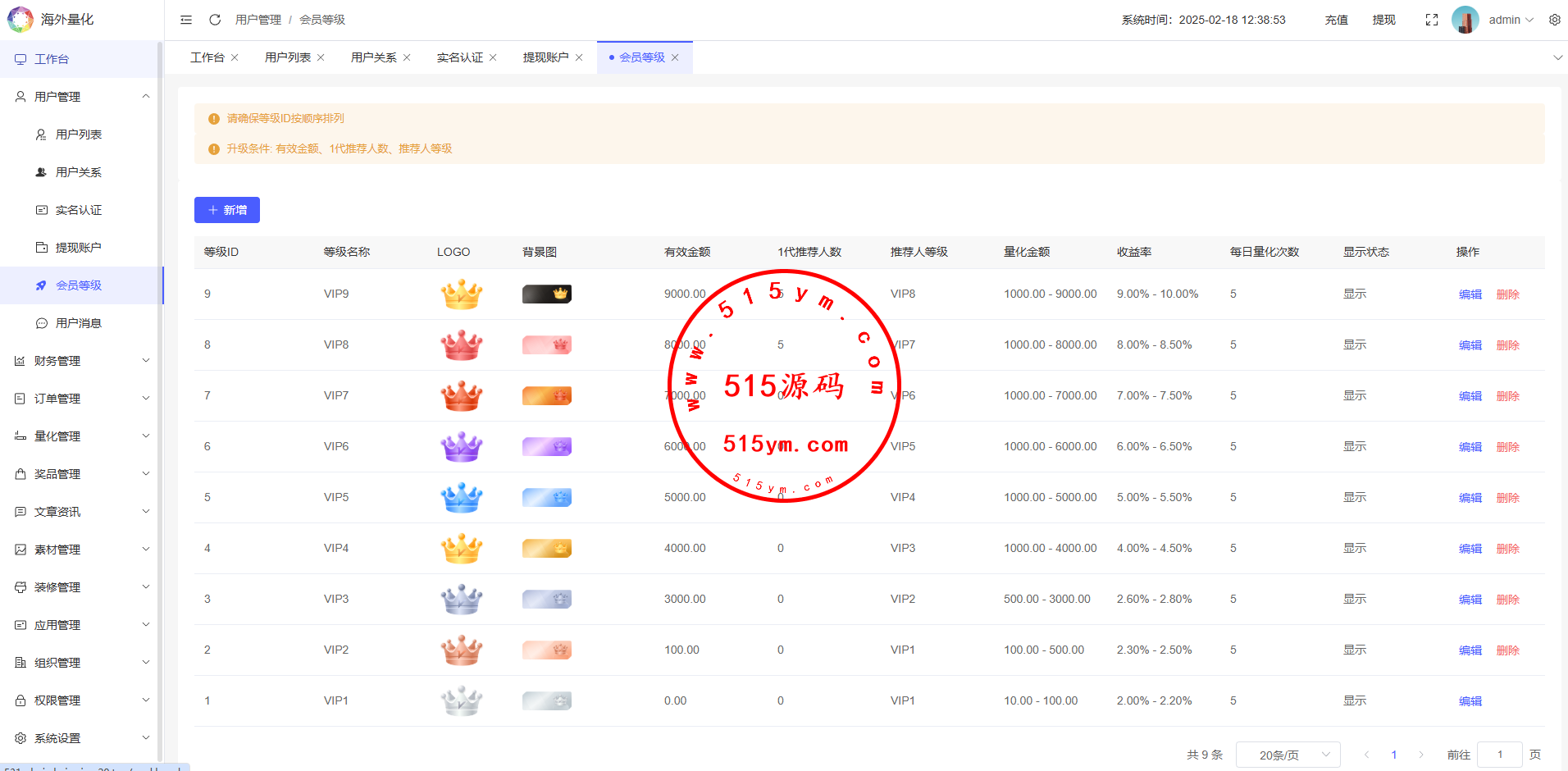 3、VIP等级划分,升级条件: 用户有效金额、1代推荐人数、推荐人等级