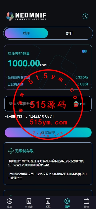 灵活质押:支持 USDT 等资产的无限制存取,无锁定期